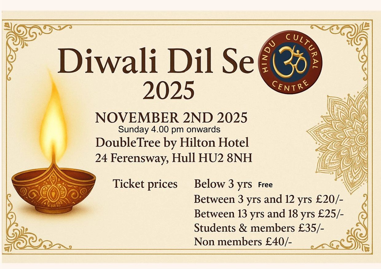 Sun 02-Nov-2025 HERHCA Diwali Dil Se Big Function @4:00 pm onwards at DoubleTree by Hilton Hotel in Hull